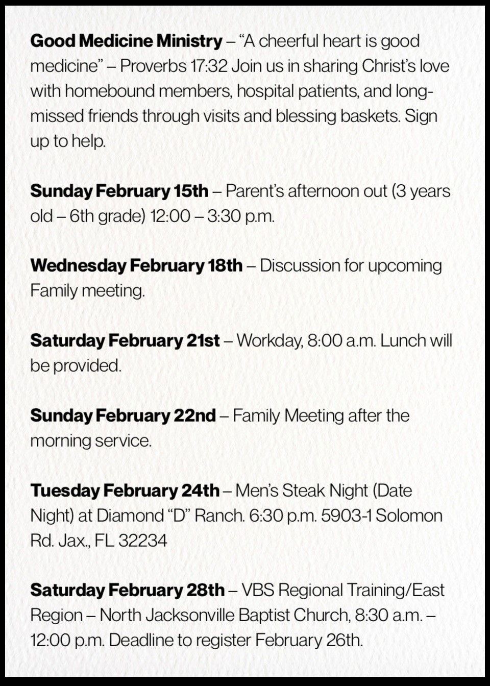 Upcoming Events + Add to Google Calendar + iCal / Outlook export Date Feb 15 - 20 2026 Expired! Time All Day Category Ministry Share this event
